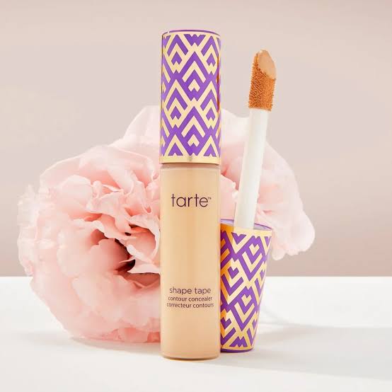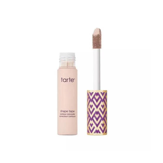 This is the Tarte Shape Tape Contour Concealer, a highly acclaimed and popular makeup product known for its full coverage and ability to conceal imperfections while providing a smooth, flawless finish. The packaging is distinctive, featuring a bold purple tube with a repeating geometric pattern in gold and a lighter lavender shade. The brand name "tarte" is prominently displayed at the top, followed by the product name "shape tape contour concealer" and its French translation, "correcteur contours."